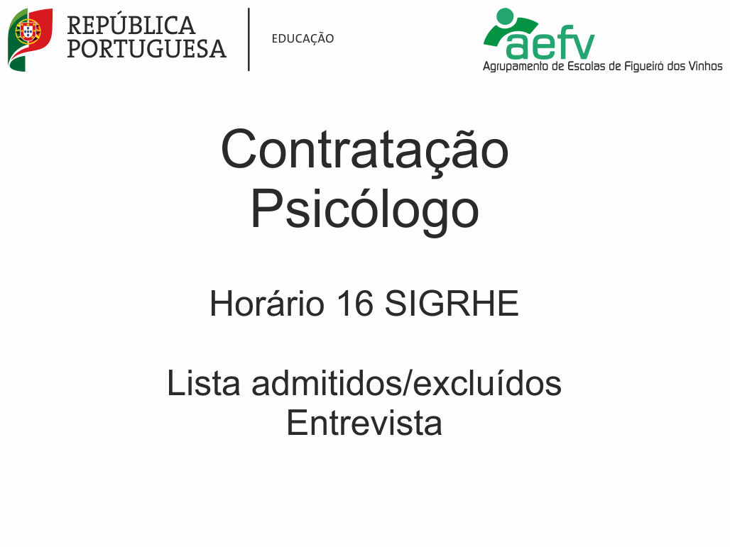 No âmbito do concurso para o lugar de Psicólogo, horário 16 do SIGRHE, publica-se as listas de admitidos/excluídos à entrevista e, datas da mesma.